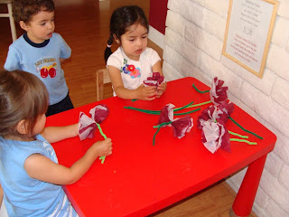 We also made some simple tissue paper flowers, I found the idea on this website. CC and Enzo each worked on three flowers. They initially had a difficult time twisting the stems but eventually got the hang of it. RJ tried making one flower but quickly lost interest and decided he would watch instead.Hope you all have a Happy Mother's Day!